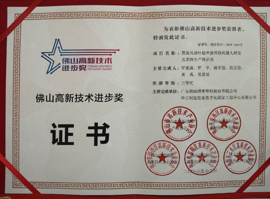 2019年1月18日,首届“佛山yb体育app技术进步奖”表彰大会在中欧中心国际会议中心隆重举行,im官网股份“贯流风扇叶超声波焊接机器人研发及柔性生产线示范”项目喜获三等奖。